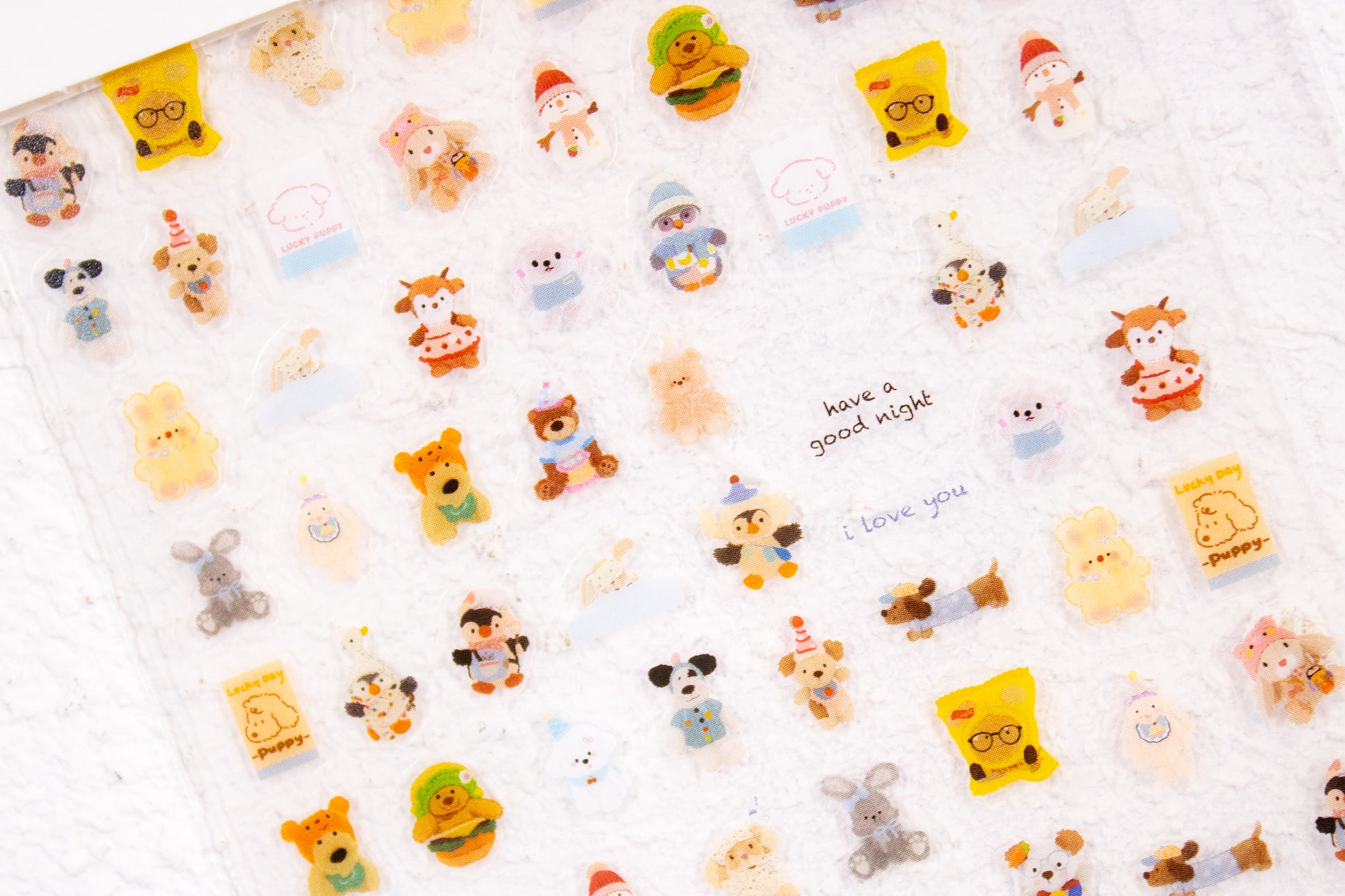 - Includes puppies, bunnies, bears, penguins, foxes, lambs, and playful sayings like “Lucky Day,” “Have a Good Night,” and “I Love You”
