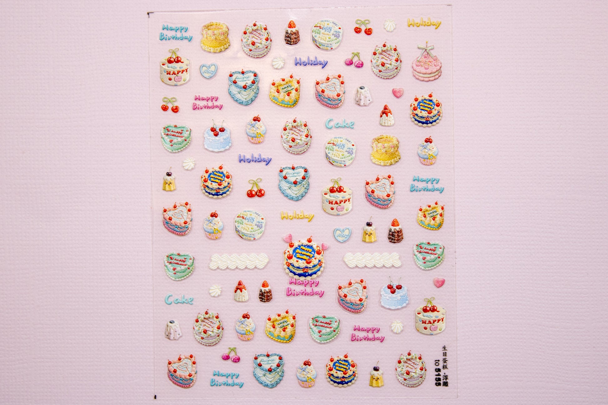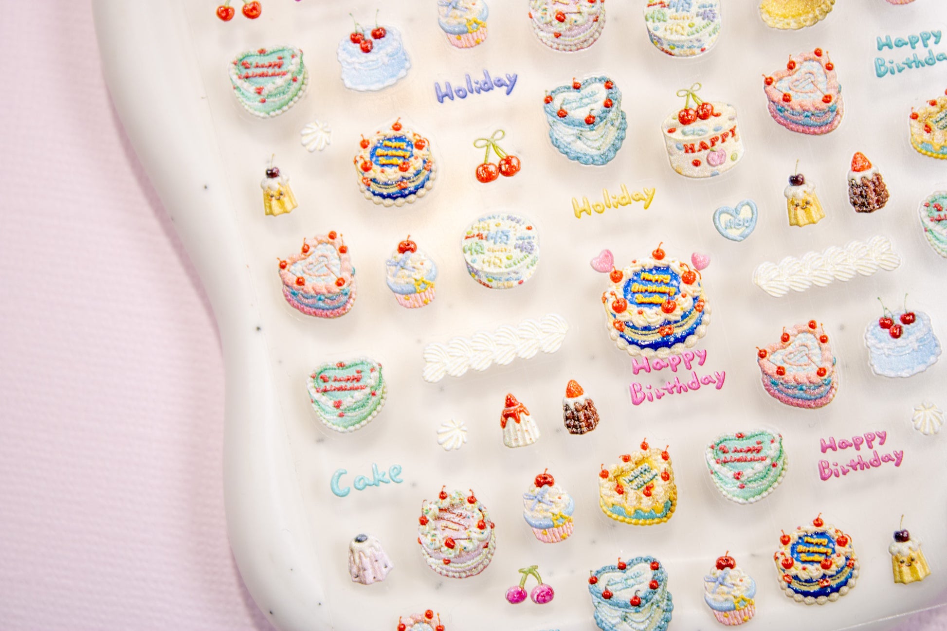 - Includes everything you need for the cutest birthday nails — assorted mini cakes (heart + whipped cream styles), cherries, hearts, tiny dessert doodles, and pastel text accents like “Happy Birthday,” “Holiday,” and “Cake.”