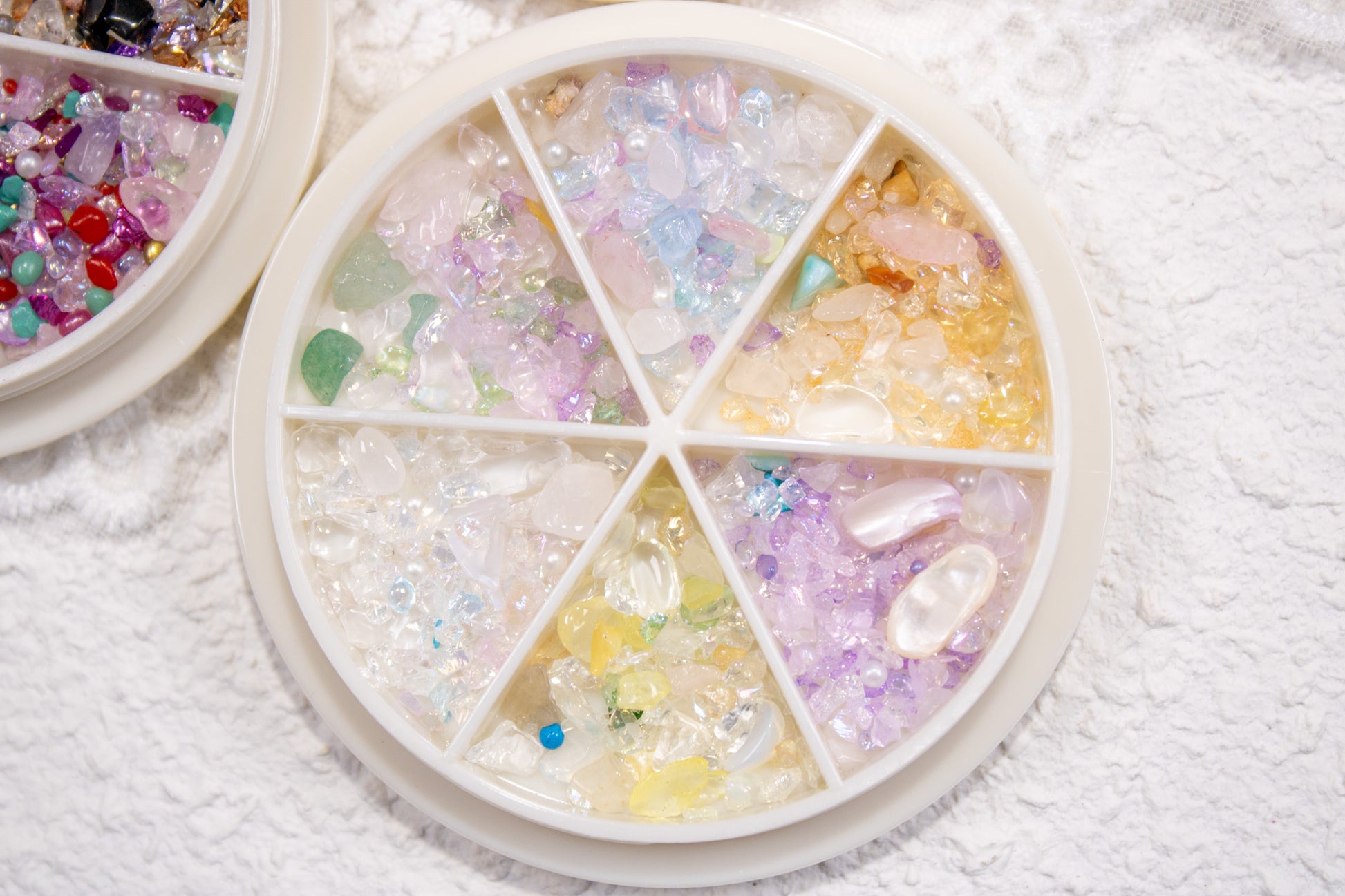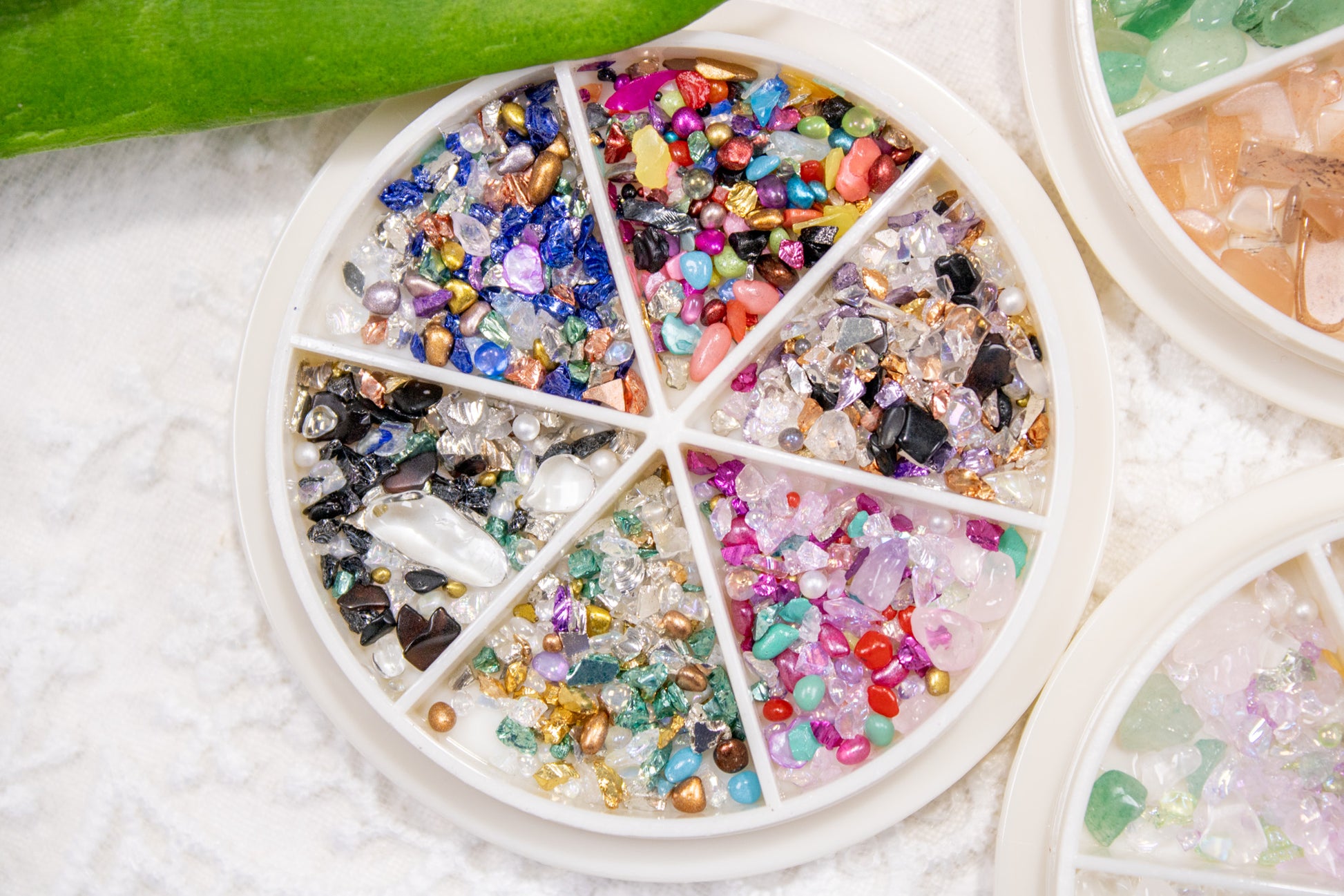 Turn every set into a miniature treasure with this crystal-packed nail stone wheel — bursting with irregular gems and sparkly bits for layered, artistic designs.