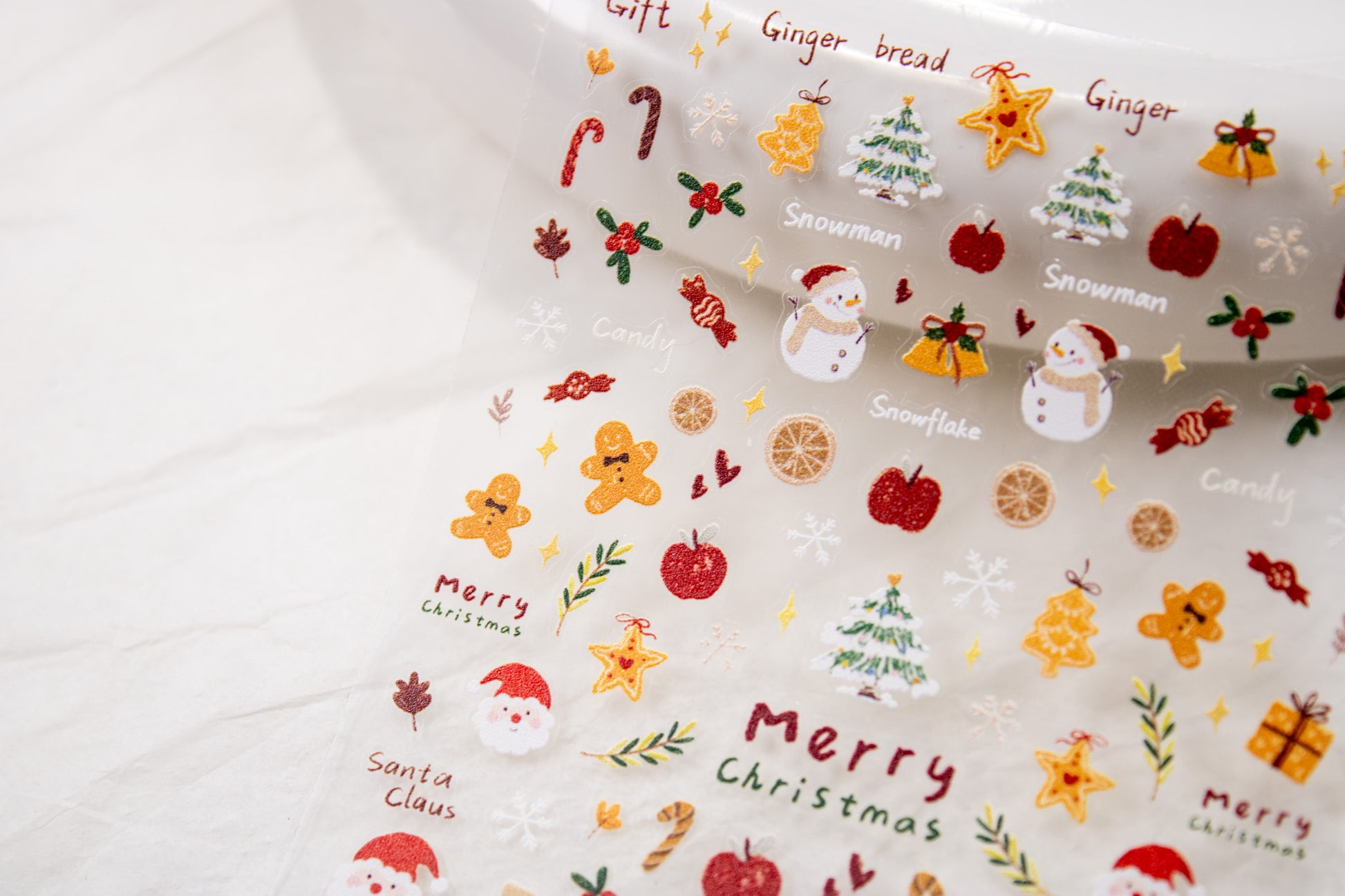 - Includes gingerbread cookies, Santa, snowmen, apples, gifts, socks, stars, trees, candy canes, and “Merry Christmas” lettering