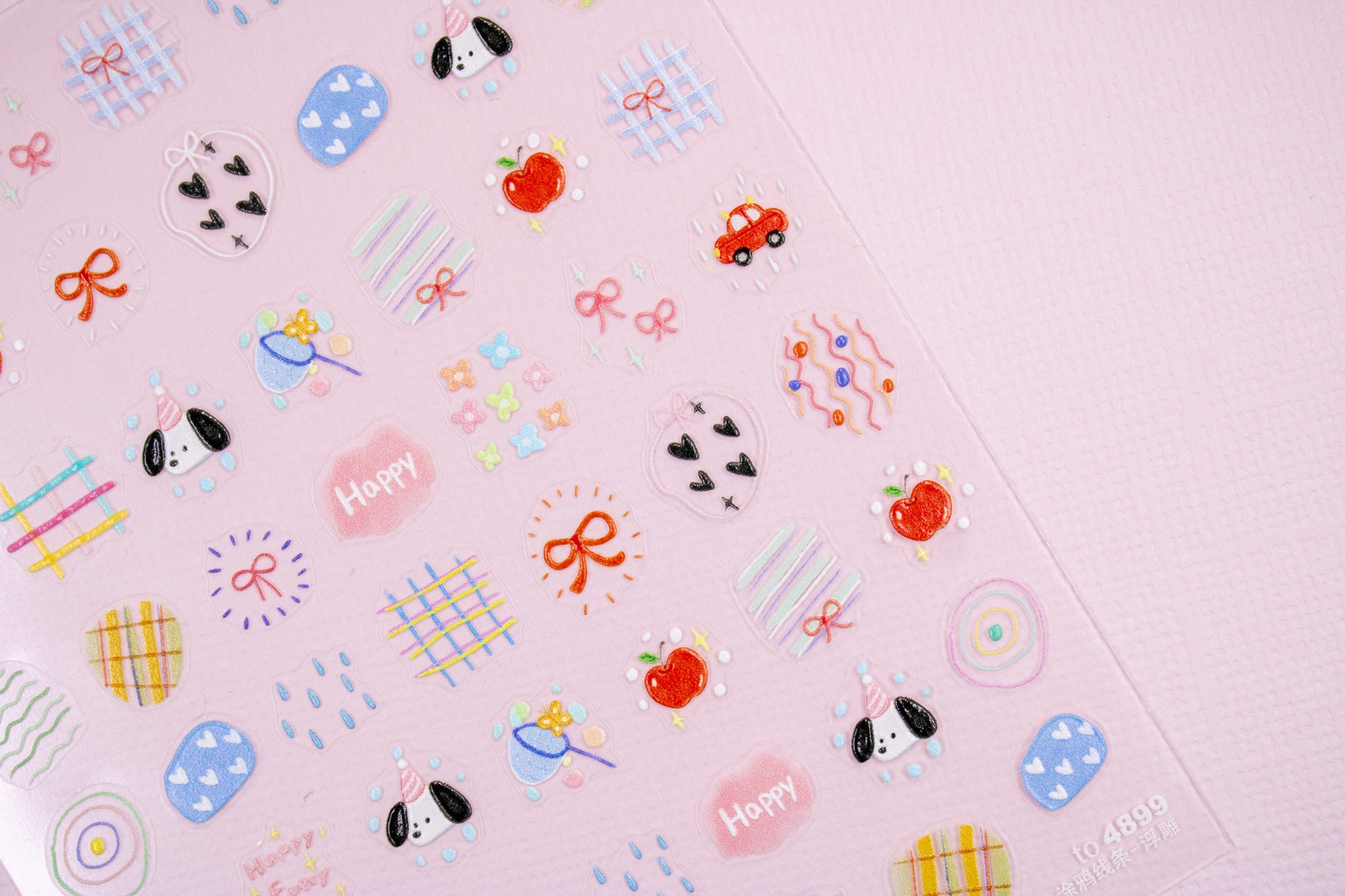 - Includes party hat puppies, apples, ribbons, colorful grids, hearts, raindrops, and playful text designs