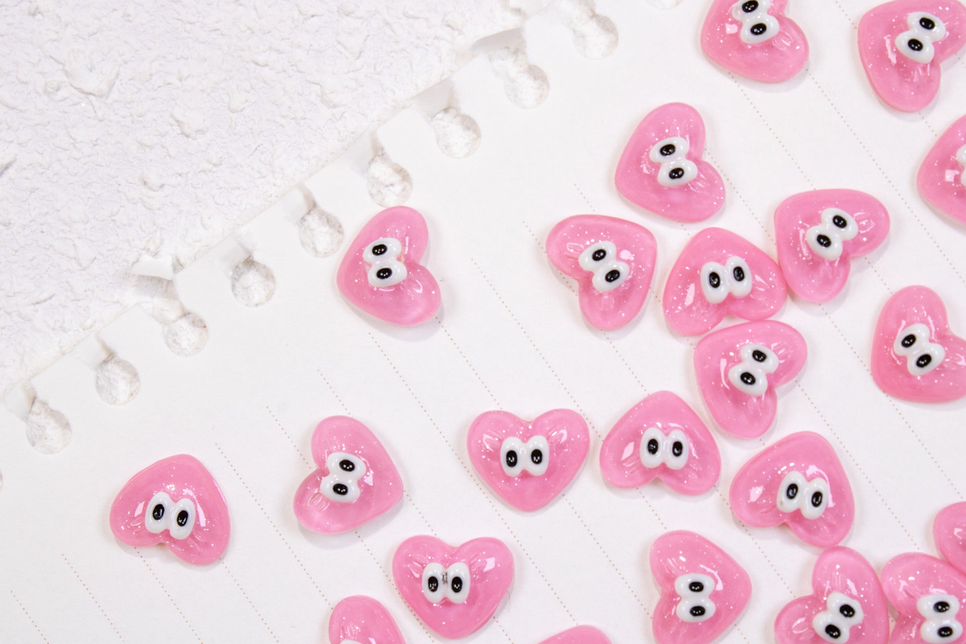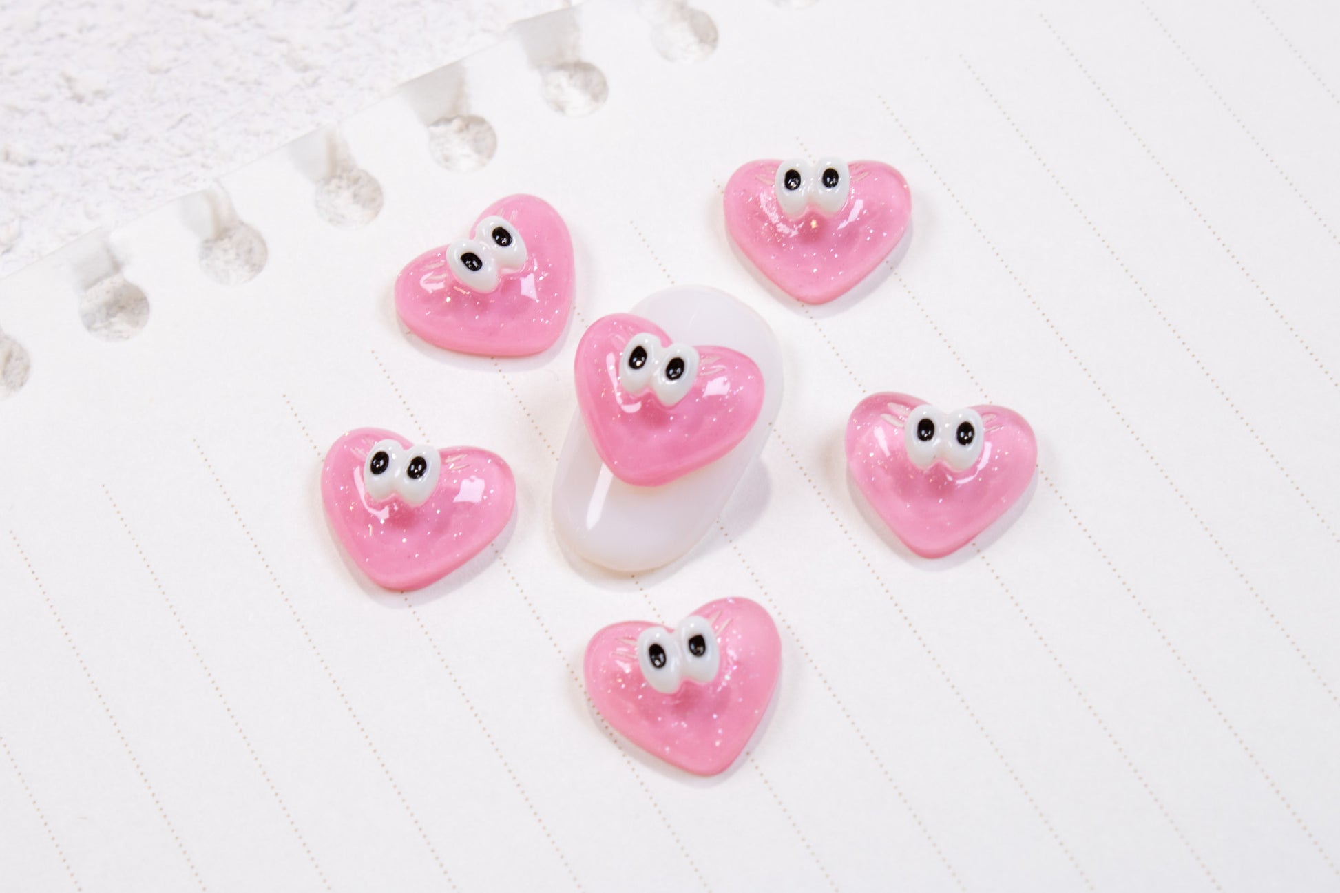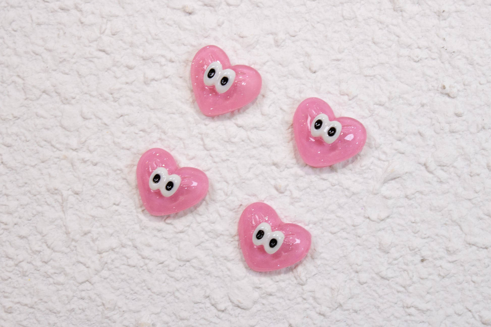 Add a dash of silly sweetness to your nails with these glossy pink heart charms topped with wiggly cartoon eyes — perfect for playful, eye-catching nail looks.