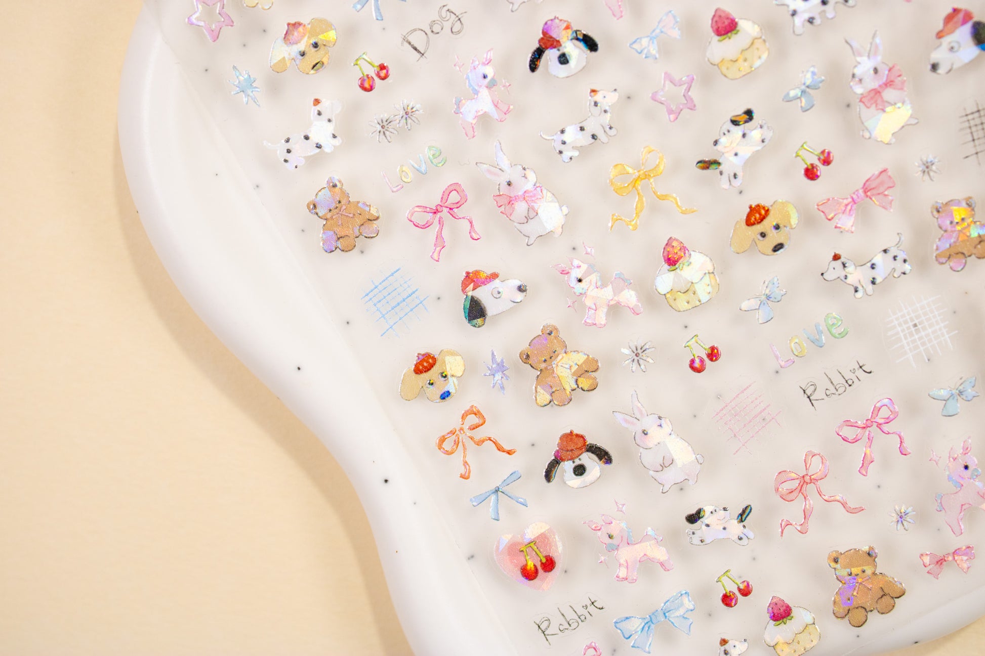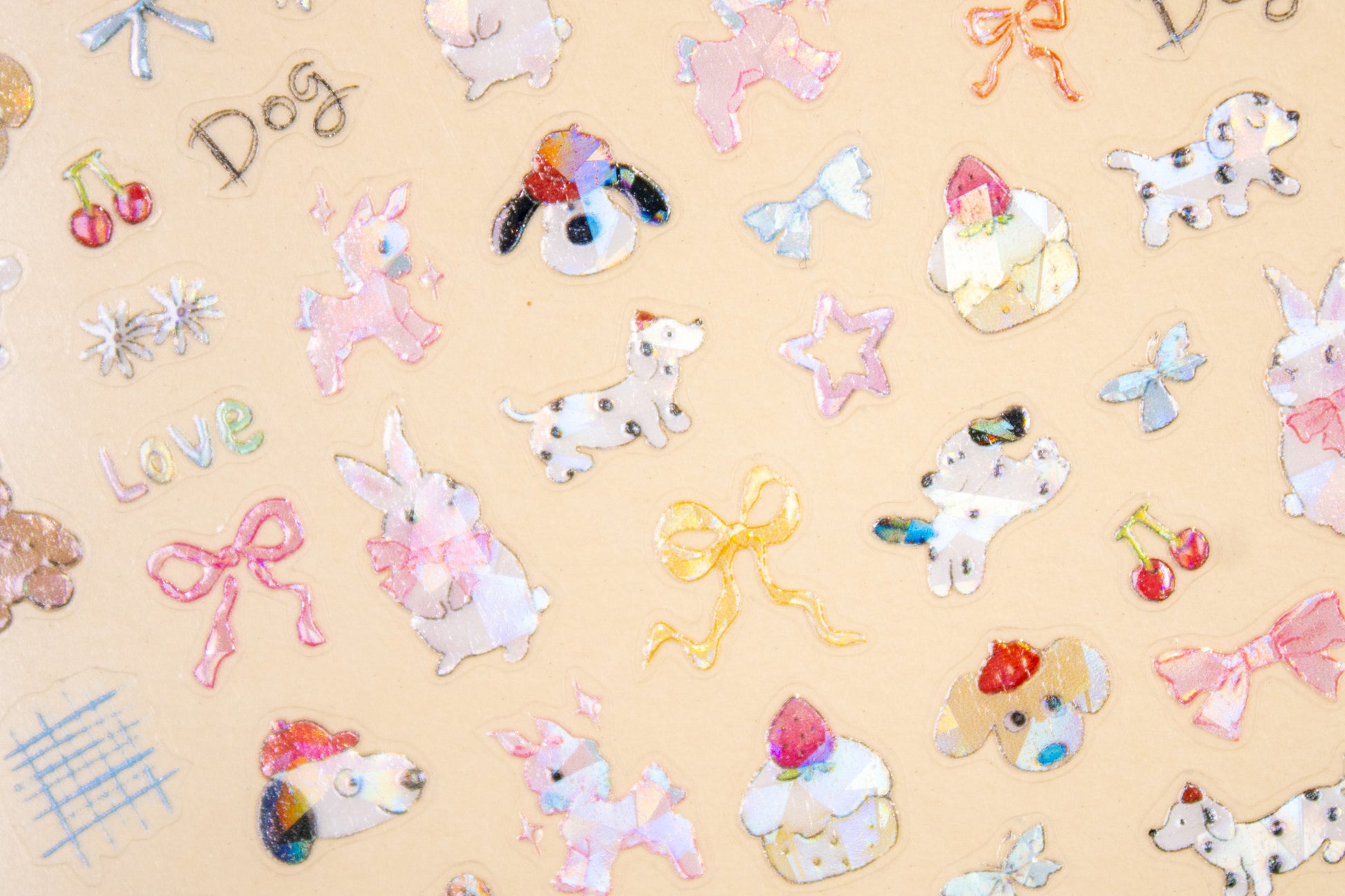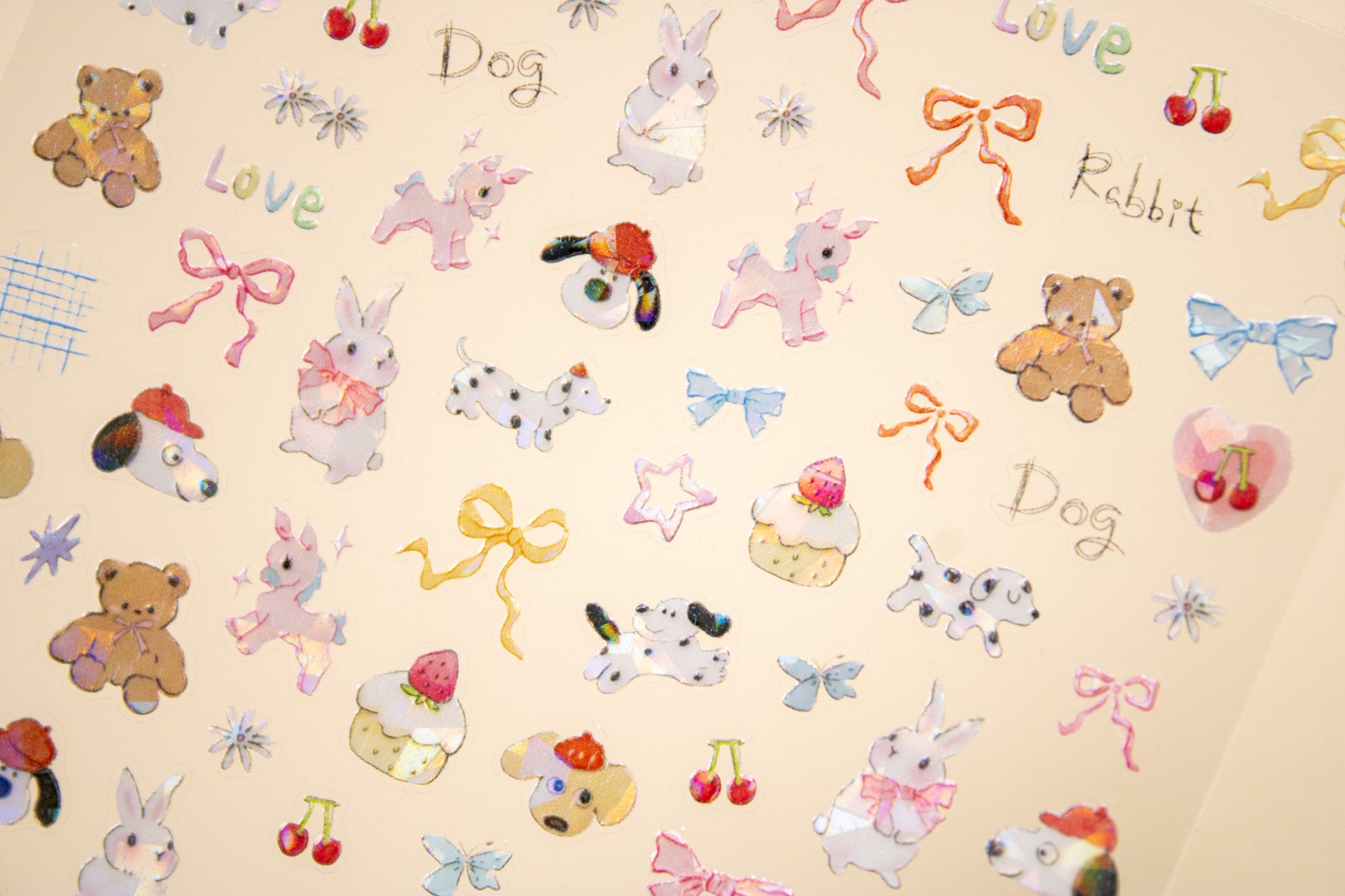 - Includes holographic-finish bunnies, dogs, teddy bears, unicorns, bows, cupcakes, cherries, stars, butterflies, and text accents like “Dog,” “Rabbit,” and “Love”