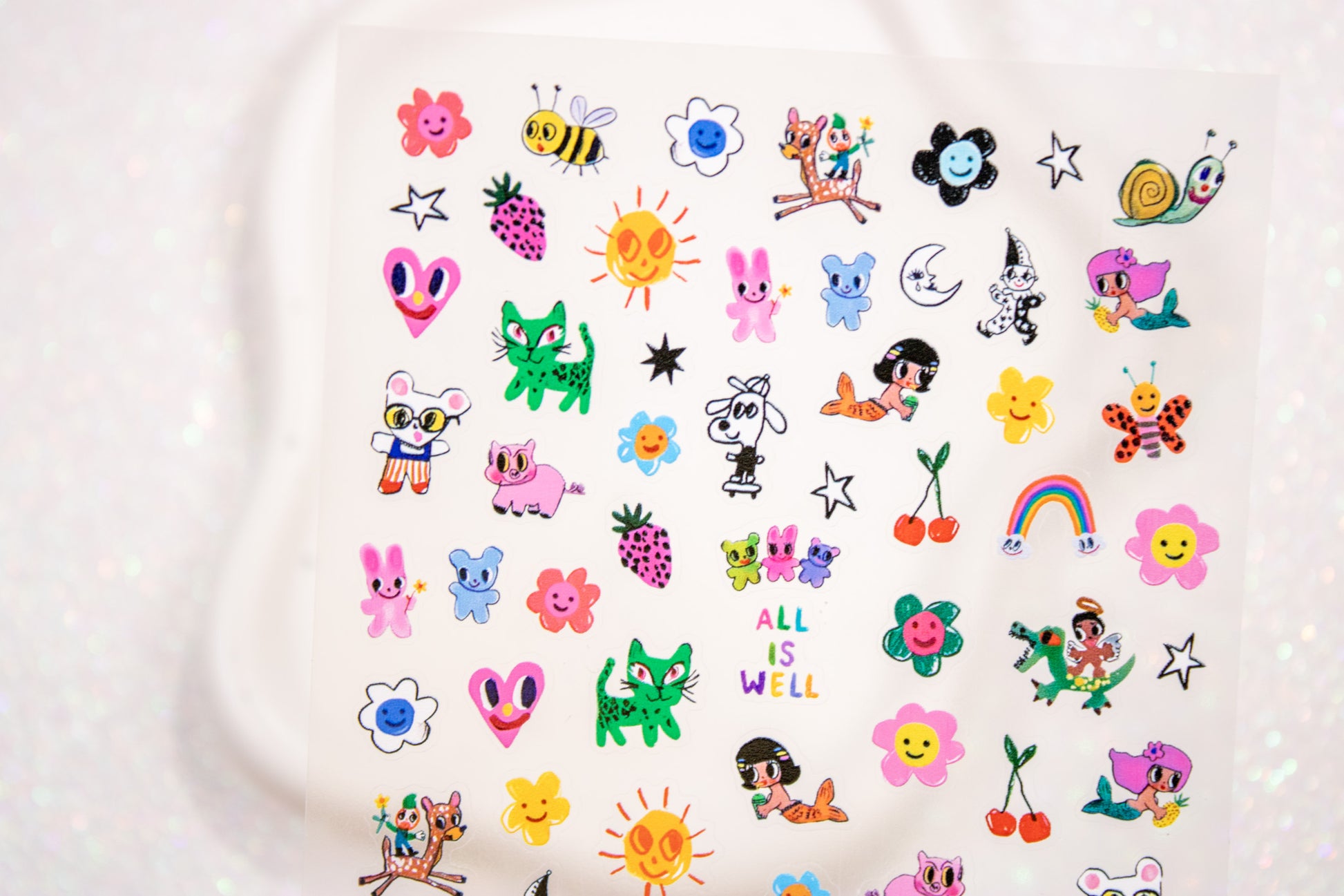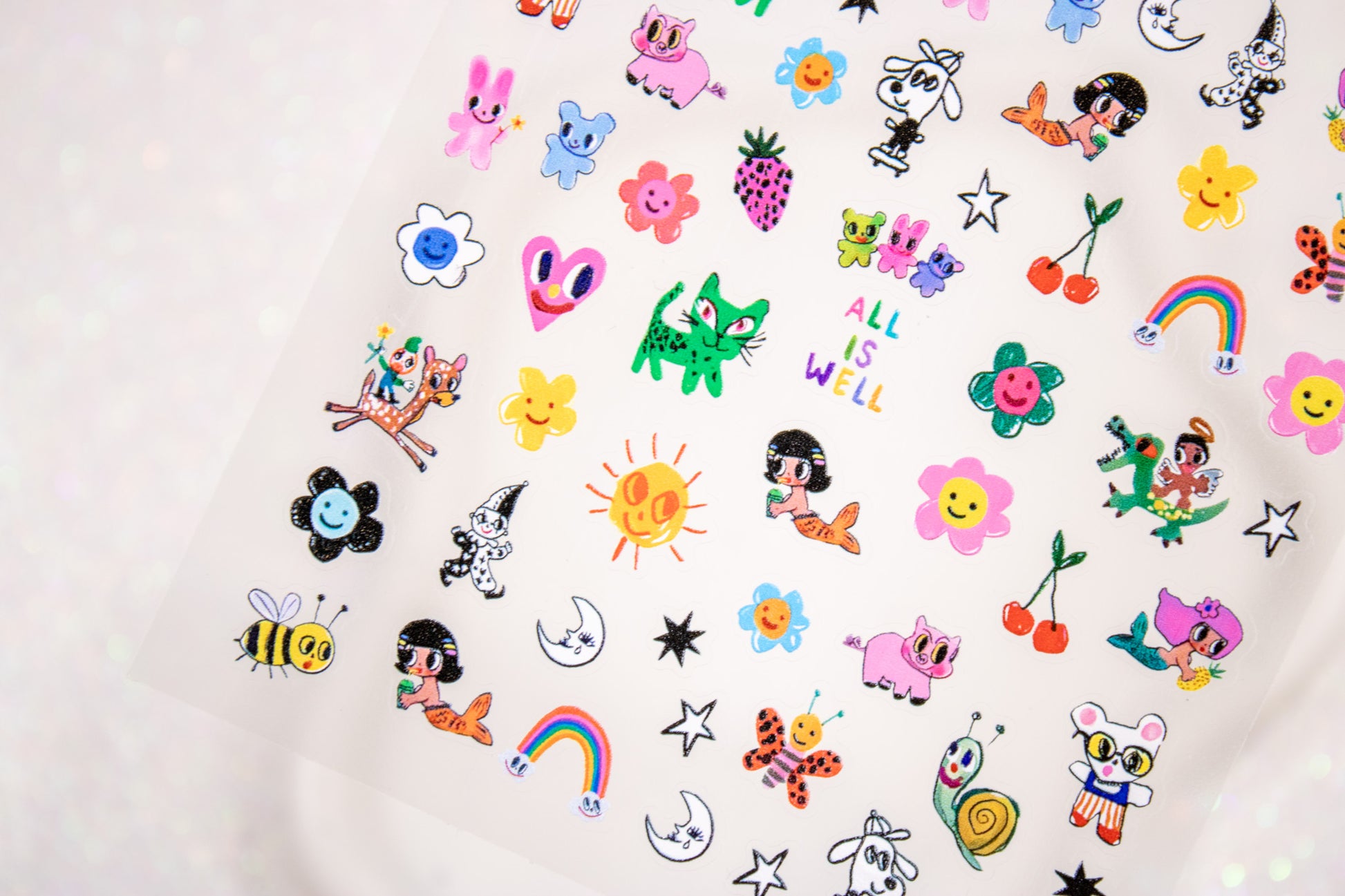 - Includes green cats, mermaids, clowns, flowers, rainbows, cherries, bees, stars, and “ALL IS WELL” text