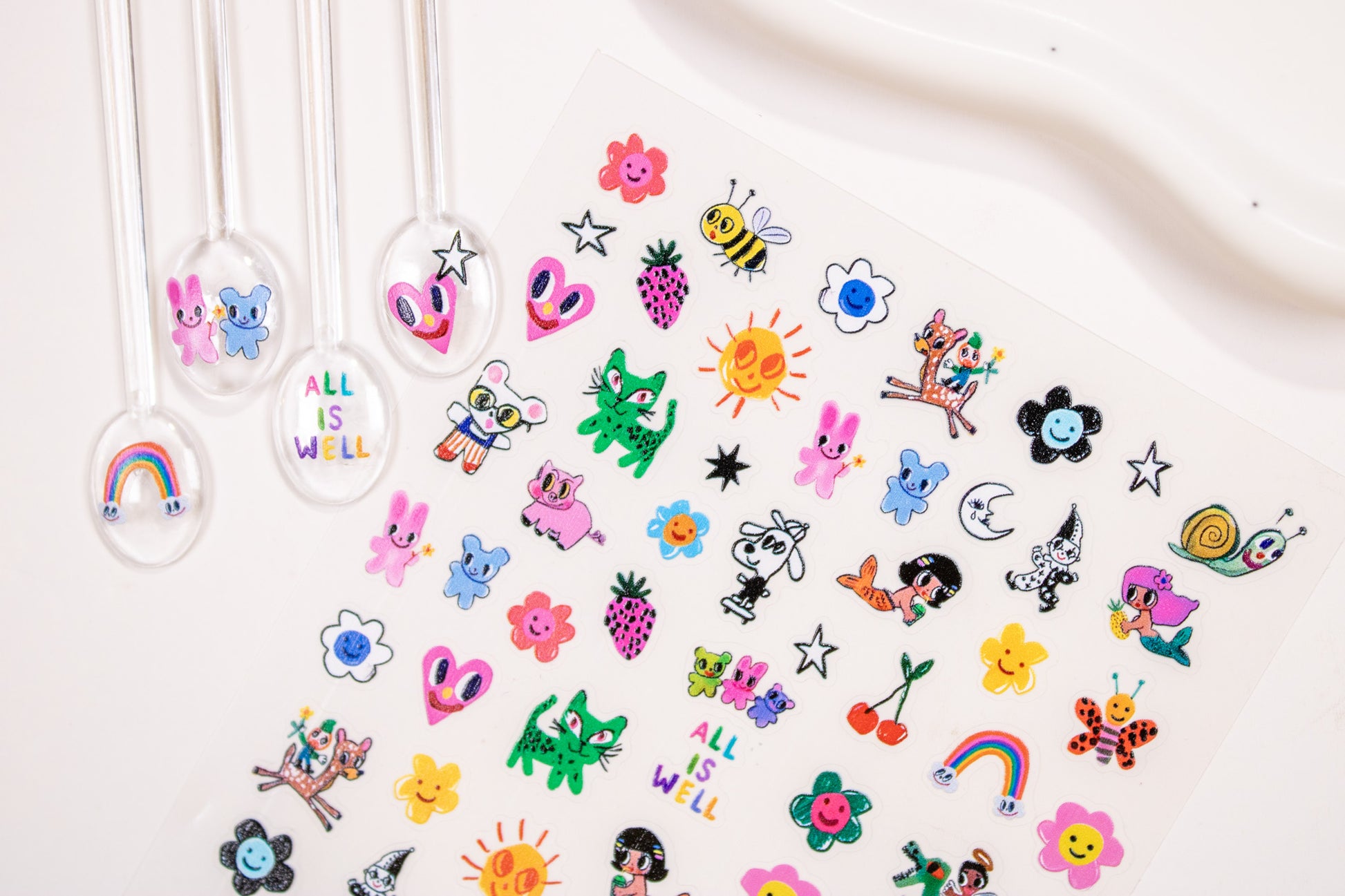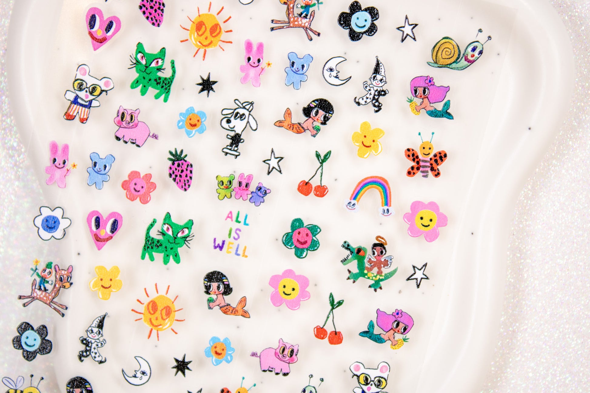 Fill your nails with playful doodles and happy vibes with this All Is Well sheet — colorful retro-kawaii characters and icons that feel like a little art journal on your fingertips. Perfect for bold, mix-and-match, or Y2K nail looks.